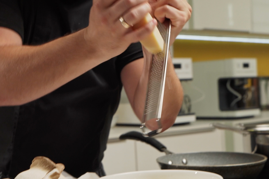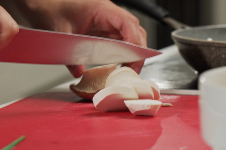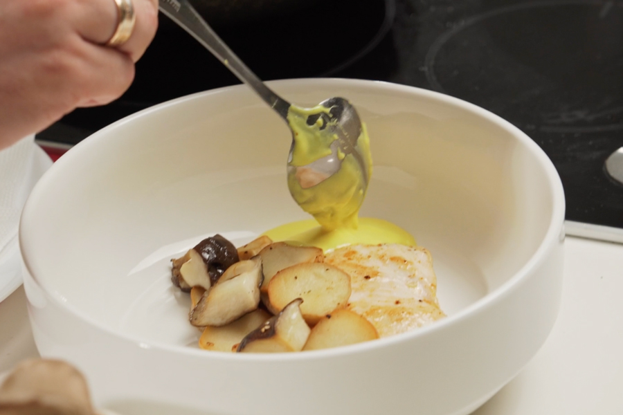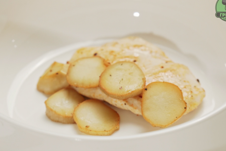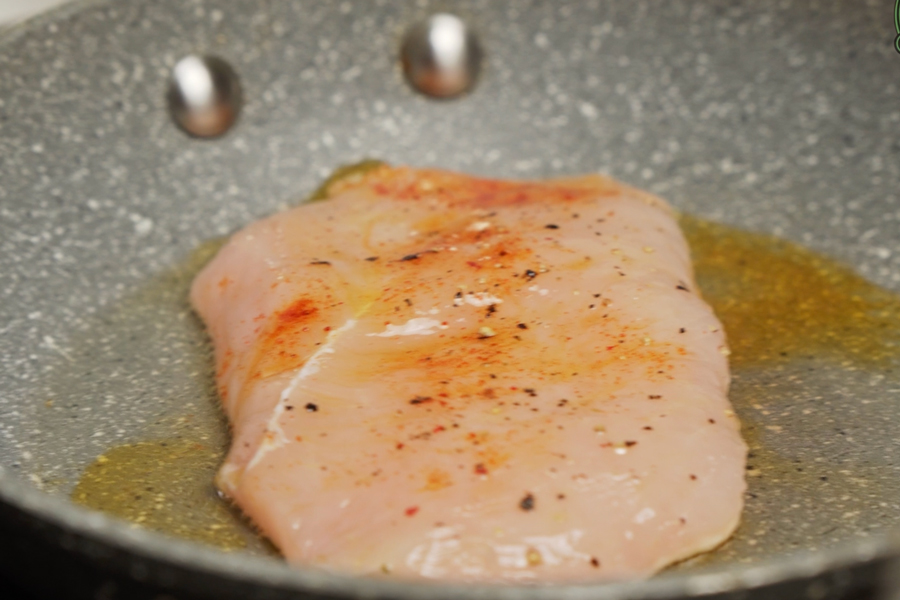 6. Розігріваємо пательню та обсмажуємо курячу грудку, з додаванням ст. ложки вершкового масла, до готовності.