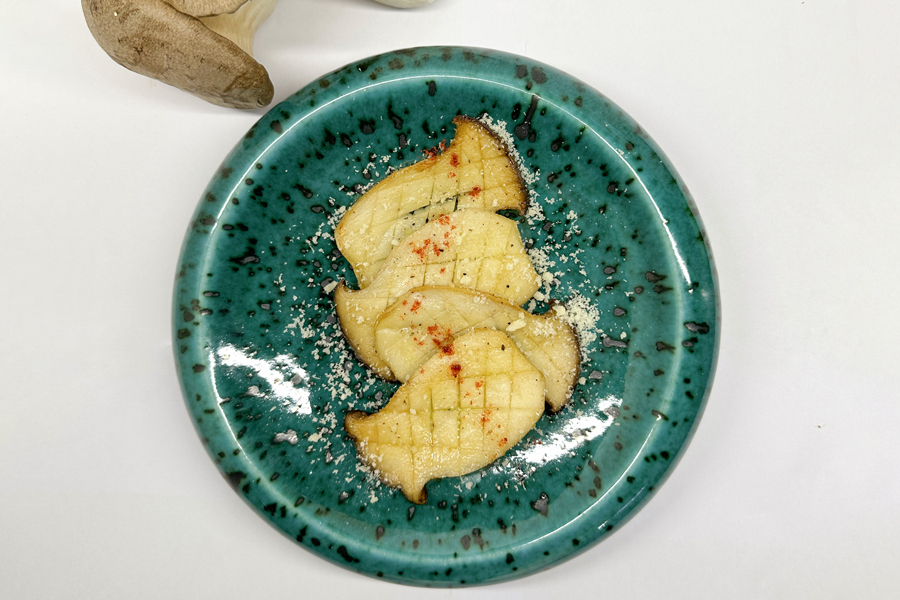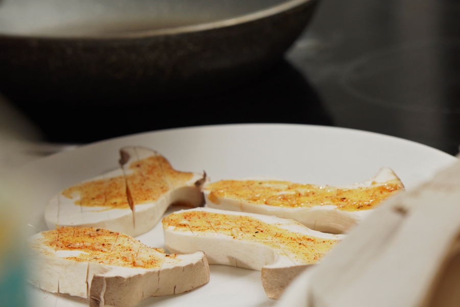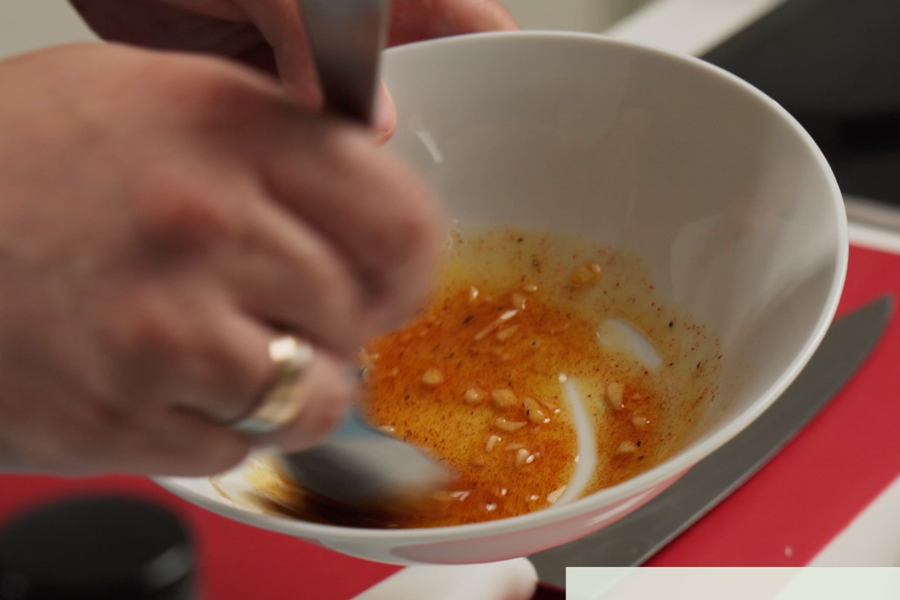 3. Змішуємо 1-2 ст. ложки оливкової олії, солі, перцю, 0,5 ч. ложки паприки та дрібно нарізаний зубчик часнику.